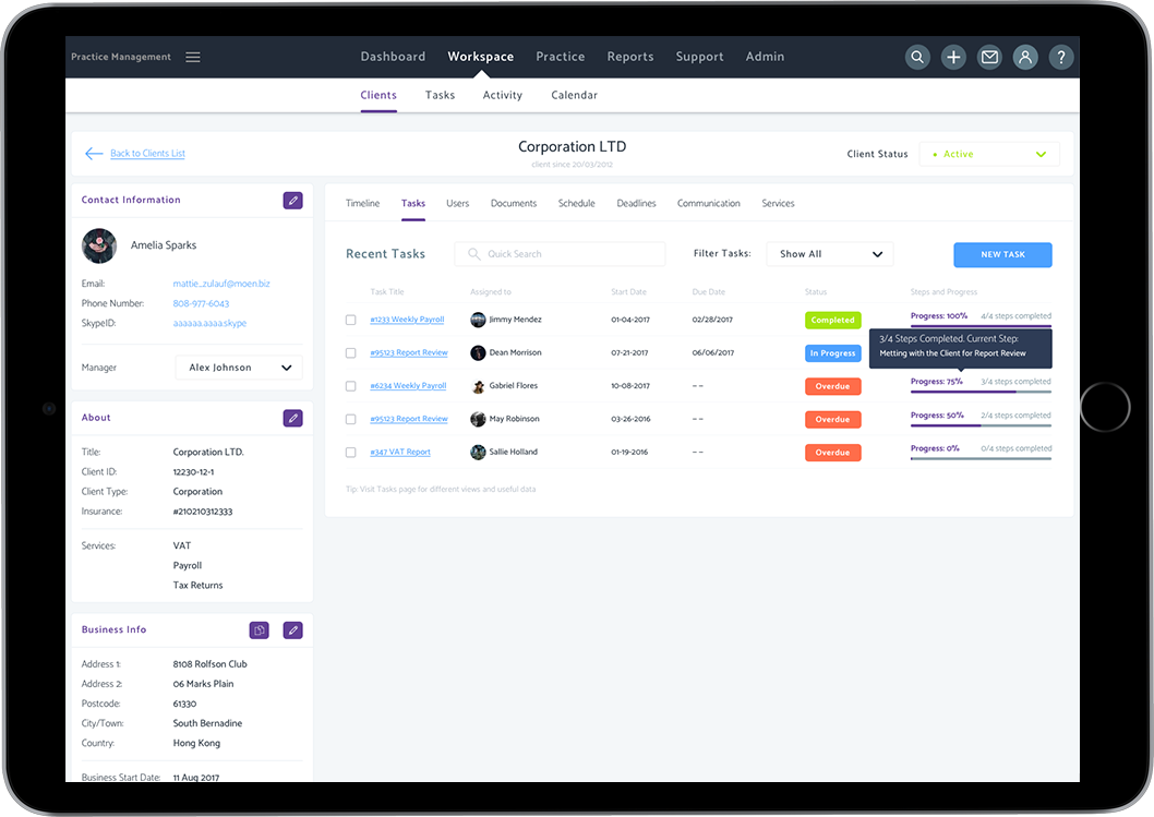 Our practice management software is a software designed to help accounting firms and professionals streamline their daily operations. This powerful software integrates various features to manage all aspects of an accounting practice, including client management, workflow management, task management, and document management. By centralising these functions, practice management software helps accountants reduce administrative overheads, improve client satisfaction, and manage their practice more effectively. Whether you’re handling client information, tracking tasks, or managing documents, this software ensures that everything runs smoothly and efficiently.
