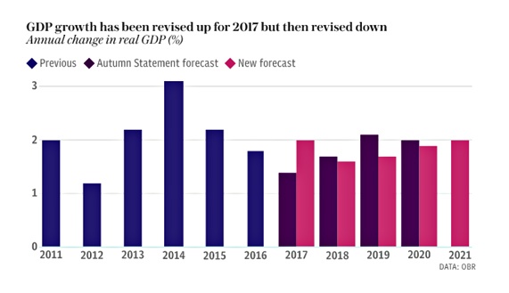 The Autumn Statement forecast showed that the GDP would decrease in 2017. This added to the uncertainty of the SME owners. However, the Spring Budget 2017 has forecasted a higher growth rate than was predicted. The Office for Budget Responsibility (OBR) reported that the economy would grow faster in 2017, and the growth forecast is updated from the previous 1.4% to 2%.