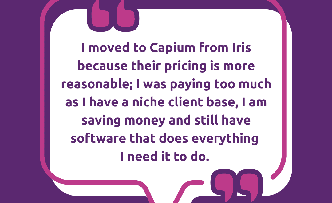 “I moved to Capium from Iris because their pricing is more reasonable; I was paying too much as I have a niche client base, I am saving money and still have software that does everything I need it to do. It was also a smooth transition from working on desktop software to a cloud-based one.