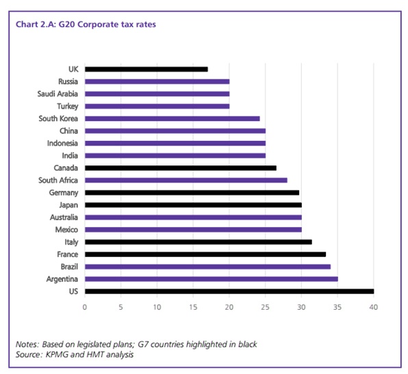 This reduction would encourage businesses to flourish in the United Kingdom and continue as one of the most open economies around the globe. And in order to maintain this highly competitive business tax regime, the corporate tax rate in the UK is the lowest in the G20.